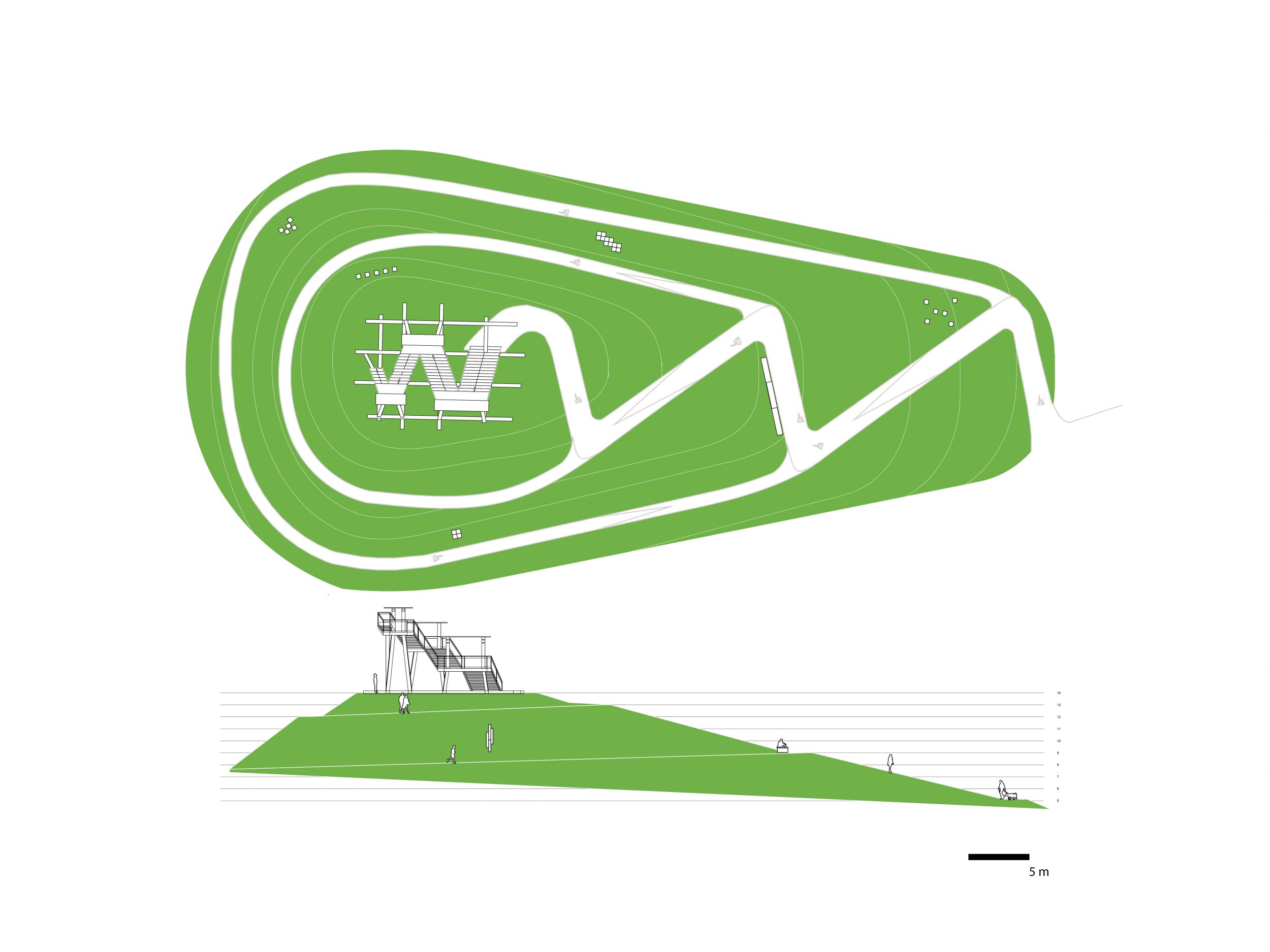 Two paths provide access to the hill: the big ramp shaped like a zig zag through the vegetation is the shortcut to the top and gives the hill a recognizable face to the neighborhood. A slow and less steep route for wheelchairs curls as a spiral around the hill to the top. These routes merge at the observation platform. Objects like seats and ecological pods for bees and butterflies are places at strategic points along these routes.